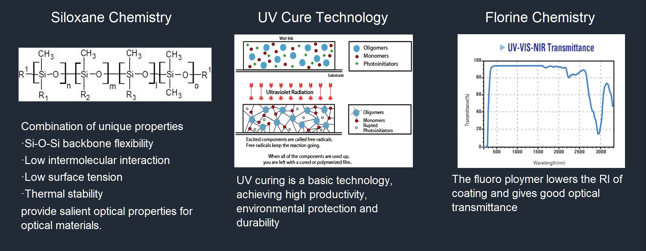 Our controlled low refractive index from 1.32 to 1.65 UV curable materials provides key functions; photonic cladding, high temperature resistance, adhesion, protection of devices from heat and moisture separately and simultaneously as required by your design rules.